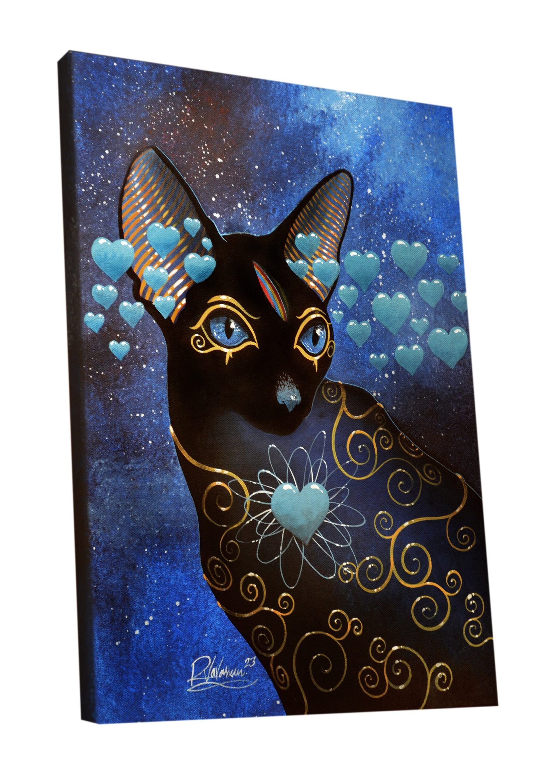 “Bastet blue heart” is a one-of-a-kind original painting where cosmic cats come alive under Raphaël Vavasseur’s brush. A soulful feline artwork filled with dreamy, ethereal beauty.