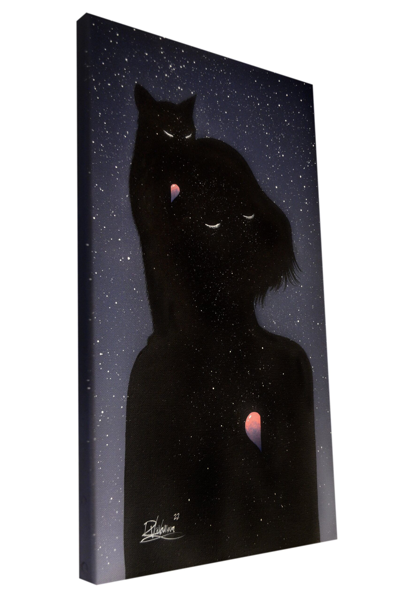 “Share my darkness” is a gentle, hand-painted original by Raphaël Vavasseur. This mystical feline painting glows with cosmic tenderness and ethereal starlight.