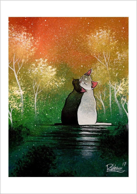 This delicate feline print, “The love on the water”, showcases Raphaël Vavasseur’s gift for soft, mystical cat art. A gentle, poetic treasure.